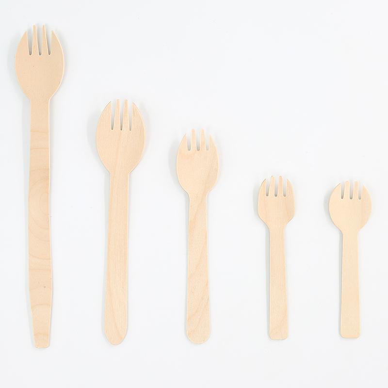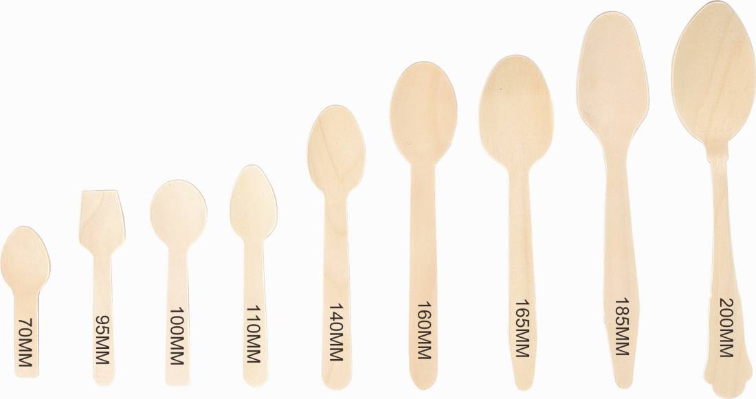 1. Unser Einweg-Besteckset aus Holz besteht aus hochwertigem Birkenholz und hat unterschiedliche Größen von 95–185 mm.