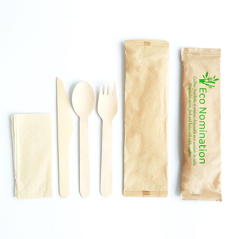 Umweltfreundliches Einwegbesteckset aus Bambusholz mit unterschiedlicher Verpackung.